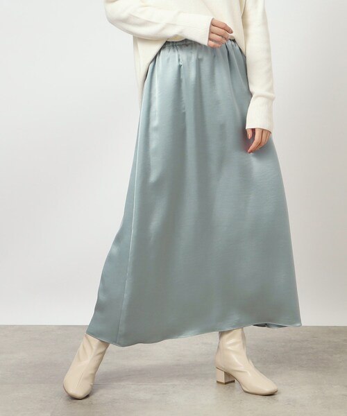 冬のあったかコーデに抜け感を! 【デザイン】 シンプルなマキシ丈のサテンスカート。 ウエストは内側に紐を通したドロスト仕様で、ウエストサイズの調整が可能なデザインです。 厚みのあるヘビーサテンを使用しており、上品な光沢感で重たくなりがちな冬のスタイルに抜け感をだしてくれます。 ナローシルエットの為チュニックなど丈が長いアイテムとも相性◎です! ※ポケットなし 【素材】 サテン組織に少し変化を持たせて光沢を消した、独特な風合いが特徴のブロークンサテンを使用しています。 ピカピカとし過ぎないほどよく上品な光沢感が特長です。 一般的なサテン素材より厚みもあり、冬のふわふわとしたニットにも負けない素材感です。 1年を通して着用いただけるシーズンレスな素材です。 ※裏地なし 【スタイリング】 ふわふわとした毛足のあるニットとのスタイリングがおすすめです! サテン素材がアクセントになり、ニットスタイルをほっこりさせずに大人っぽく仕上げてくれます。 ウエストがドロスト仕様で大きさの調整が効くため、ジャストで履いたり、ローで履いたりと、ウエスト位置の調整が可能です。 足元はヒールのブーツならきれいめな印象になりますし、エンジニアブーツなどカジュアルな合わせもおすすめです。 スニーカーで外したスタイルも◎バレエシューズで女性らしい合わせも素敵です。 こちらの商品は主に冬に着用いただける商品です。 モデル情報:身長166cm B80 W59 H86 着用サイズ:02(M) 店舗へのお問い合わせ商品番号:768-77026 ●製品寸法: 01(S):総丈85cm W63~89cm H105cm 02(M):総丈87cm W66~92cm H108cm 03(L):総丈89cm W69~95cm H111cm 04(LL):総丈91cm W72~98cm H114cm 05(3L):総丈91cm W75~101cm H117cm 備考: