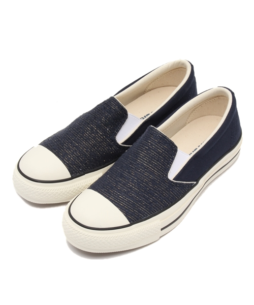 コンバースならではのファッショナブルなレディースライン「CHUCKS SISTERS」のアイテム。 トレンド素材のファンシーツイードをヴァンプ部分に落とし込みシンプルに仕上げたオールスター。 キャンバスとコンビ使いにすることでシックになり過ぎず、ラメ入りの素材感でカジュアルかつ大人っぽい印象を演出。 人気のスリップオン仕様。