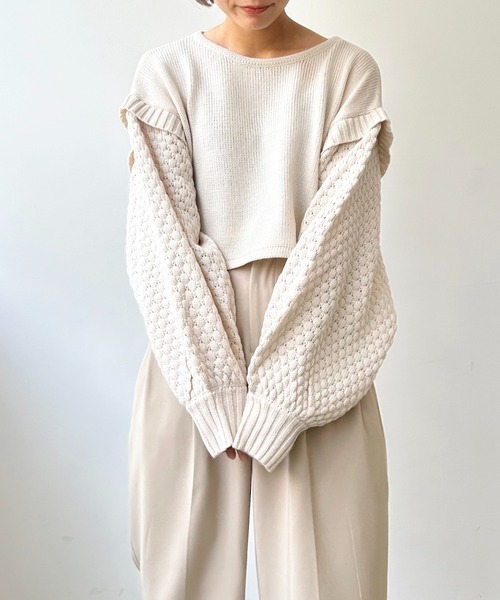 【Melirich】芦屋発ブランド「Melirich」。自分らしく流行に左右されず、自由に贅沢にオシャレを楽しみ女性に心豊かになってほしいをコンセプトとしたStyleSeaの姉妹ブランドが登場。【Design/Fabric】■ポップコーンのようなポコポコ生地のボリュームスリーブが可愛いルーズなサイズ感とニットの厚みが絶妙◎!ショート丈なので、ボトムとのバランスもとりやすく、スタイリングに悩まず着れる♪身頃はスッキリとシンプルなので、袖のデザインとメリハリがあって着膨れしてみえない!■体型カバーポイント【デコルテ】【ウエスト】【二の腕】【スタイリング】・トレンドのハーフパンツやタック入りデニムを合わせて、メンズライクなボトムでも甘辛MIXで相性◎・プリーツスカートや、ナロースカートなどで合わせるとよりフェミニンなスタイリングに♪・インナーにはタートルやシャツを合わせるなどレイヤードスタイルも楽しめます!・バケットハットやクローシュハットなどの小物、キルティングショルダーやスマホショルダー、足元はショートブーツやサイドゴアブーツ、スニーカーやローファーなど、小物次第で自由にムードチェンジができるので、飽きがこず長くご愛用いただけます。・旅行やレジャーにもオススメです。【生地】――透け感:なし厚さ:普通伸縮性:あり――――――― ―――お取り扱い上のご注意―――[色味・サイズについて]ご覧のモニター環境や撮影環境(光の照射や角度)により、実際の商品と多少色味が異なって見える場合がございます。また商品画像はサンプルのため、稀にサイズ変更がある場合がございます。予めご了承くださいませ。[シワについて]発送上の状態によって商品がシワになる場合がございます。[においについて]密封状態で入庫し、検品時に再度袋詰めを行っておりますが、素材により染料等の臭いが若干残っている場合がございます。使用していくと臭いが抜けていくのでご安心下さいませ。[柄物アイテムについて]・全ての柄のつなぎ目は合っておりません。・生地の裁断にて、柄の出方が1点1点異なります。※柄のご指定は出来かねます。[色落ちについて]商品により色落ち・色移りがある場合がございます。品質表示を必ずご確認のうえ、着用、お洗濯、保管をお願い致します。《『♡』マークを押してお気に入り登録でお得な情報がたくさんゲット♡》―――――商品のお気に入り登録―――――★ラスト1点のお知らせ ★再入荷 ★セール ★クーポン対象 ★お気に入りの商品コーディネートなど様々な通知をお知らせいたします。――――ブランドのお気に入り登録――――【新作商品】【再販商品】など、お得な情報を受け取ることができます♪是非ともお気に入り登録をお願い致します。