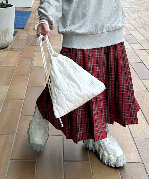 ハートのキルティングがキュートな巾着バック▼デザイン・トレンド感のある中綿入りのキルティング素材・さりげないハートのキルティングがキュート・落ち着きのあるブラック、コーディネートに馴染むホワイト、今季トレンドのシルバー、アクセントカラーのピンクの4色展開・巾着バックでおしゃれ度アップ◎・スタイリングのアクセントとして活躍します