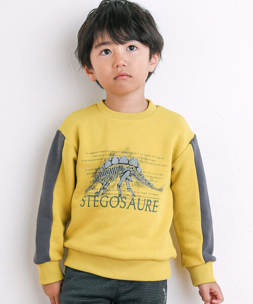 存在感のある恐竜プリントがかっこいい男の子用トレーナー。 オフホワイトとグリーンにはトリケラトプス、イエローにはステゴザウルスをデザイン。 博物館の骨格標本をイメージし、恐竜の背景にはその生態の説明をプリントしています。 配色生地をライン状に切り替えた袖もメンズライクでおしゃれ。 後ろに入れた足跡の刺しゅう入りのロゴもさりげないポイントになっています。 恐竜が大好きな男の子におすすめの、ちょっぴりお兄さん顔のコーデが叶う1着です。 TRICERATOPS トリケラトプス STEGOSAURE ステゴザウルス Dinosaure 恐竜 【10月 BOYシーズンテーマ】 古生物学者 -Paleontologiste- パリにある世界屈指と言われる恐竜博物館。 その博物館で働く古生物学者をイメージ。 化石を発掘して研究するアクティブなイメージからワークテイストをMIXしたスタイリングで提案します。 イエロー・キャメル・ブラウンを中心に、グリーンを差したカラーリングで展開。 【2023 AW Collection】 Je veux devenir... -ジュ・ヴ・ドゥヴニール(わたしのなりたいもの)- お気に入りの服を着ると、なりたい自分になれる。 上質でクラシカルなトラッドスタイルを自由な着こなしでアップデート。 私らしく進化した新しいスタンダード。 好きなものをいっぱい詰め込んで、“なりたい”をかなえるファッションを提案します。 【BeBe(べべ)】 "LOVE MODERN" 少しおませで、生意気なヨーロピアンカジュアルの提案。 時代性・流行性をとらえ、ベーシックでもワンポイントを施した遊び心、楽しさを盛り込んでいます。 シンプルだけど、こだわりのあるオリジナリティーを重視しています。
