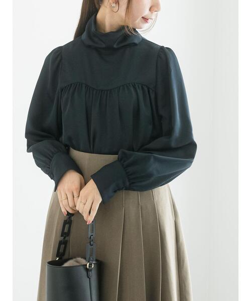 上品なサテン素材で仕立てたハイネックデザインのブラウス。 ウェーブする切り替えもアクセントをプラス。ギャザーたっぷりのフレアシルエットで、女性らしい柔らかな印象を与えてくれます。 デイリーカジュアルはもちろん、デートや女子会などのシーンにも活躍してくれる大人女子に嬉しいアイテムです。 ※商品画像は、撮影環境やお客様のご利用のPC・スマートフォンのモニター環境などにより実物と色味に差異がある場合がございます。