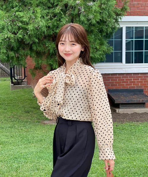 細かいドットがポイントのリボンブラウス✨ 程よい透け感で、コーデに抜け感を出してくれます! フロントのボタンで着脱ができます! ジャケット合わせやデニムと合わせて カジュアルに着てもかわいいです♡