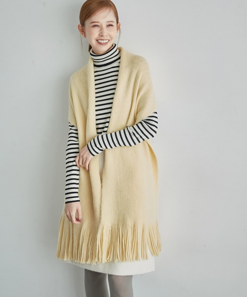 表情豊かなラッセル編み。ふっくらとした質感に癒やされるストール。 【素材感】 ・再生ポリエステルを使用した、サステナブルなアイテム。 【デザイン・シルエット】 ・春まで使える明るいカラーを取り揃えた大判ストール。 ・合わせやすいシンプルなソリッドカラーで、サイドのフリンジが動きを添えるアクセント。 【カラー】 ・ライトグレー、アイボリー、ライトブルー、レモンイエローの4色展開。 【スタイリングポイント】 ・秋冬の重たいコート類には、アクセントで合わせると明るいイメージに。 ・ケープ風に肩掛けしたり、ボリュームたっぷりに首に巻いたり、アレンジ自在。 ※撮影時の光、お使いのモニター環境によって色の見え方が違う場合がございます。