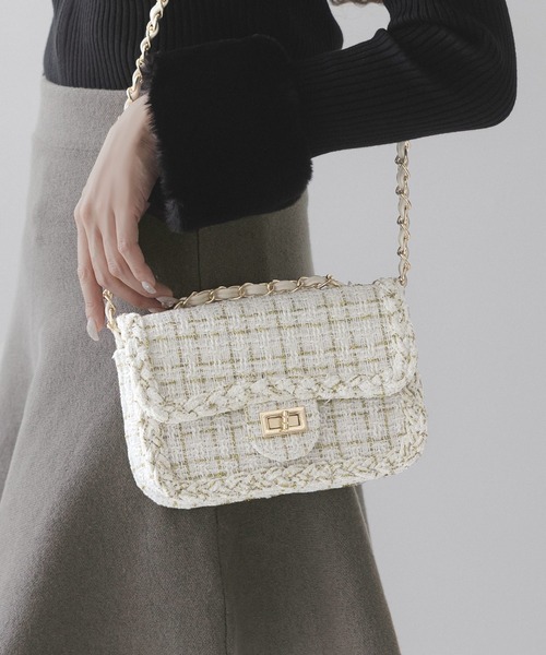 上品な印象のツイード素材でシーズンムードたっぷりのバッグ。 ゴールドの金具が大人っぽさもプラスしてくれます。 普段使いはもちろん、お呼ばれなどにもぴったり◎ ・重量約418g ・内ポケット1個付き ・ショルダーストラップは取り外し不可 ※画像の小物類は付属いたしません。容量のお目安となっております。 【カラー】ブラック・ホワイト 【サイズ】ONE 【素材】ポリエステル 【ポケット】内:1 【ファスナー】無し ※撮影時のライティングやご使用のモニター環境により実際の商品と多少色味が異なって見える場合がございます。 ※生産時期によりカラーやサイズに多少の誤差が発生する事がございます。 ※密閉した状態で商品を入荷しておりますので、店頭にある商品とは違い匂いが多少強く感じられるものもございます。 数日のご使用や陰干しなどで気になる匂いはほとんど感じられなくなりますので、お試しいただきますようお願いいたします。 ■商品のお気に入り登録■ 完売カラーの再入荷や、セール、ラスト1点など通知を受け取ることができます。 ■ブランドのお気に入り登録■ 新商品や再入荷などの情報をお知らせいたします。 是非、お気に入り登録をご活用下さい。
