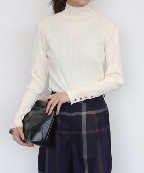 ■ゴールドボタンハイネックニットプルオーバー 【デザイン】 着回し力抜群のハイネックニットプルオーバー。 袖のゴールドボタンがアクセントに。 シンプルなデザインで合わせるボトムスを選びません。 【スタイリング】 今年らしくワイドパンツやカーブデニムなど ボリュームのあるボトムスとも相性抜群。 すっきりとしたシルエットなので ライダースやデニムジャケットなどコンパクトな アウターの中にも着込めます。 -------------------------------------- 透け感:なし 裏地:なし 伸縮性:あり ケア方法:手洗い可 ※お洗濯の際は洗濯表示を必ずご確認ください。 --------------------------------------