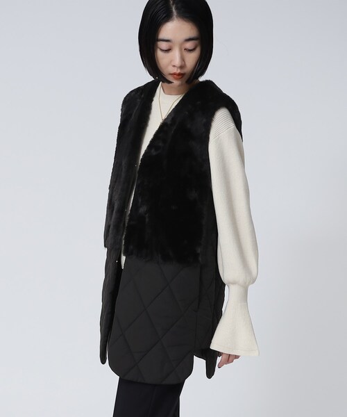 Design Point 肌触り◎なエコファーと中綿キルティングの異素材コントラストが楽しめるコンビベスト。 深めのアームホールなので厚手のシャツやローゲージニット合わせも可能です。 ※ポケット数:横×2 Styling Point 素材感を活かしてボトムスやワンピースでシンプルに合わせるのがおすすめです。 Fabric Point 滑らかな肌触りのエコファーと、ソフトな風合いのキルトのコンビネーション。 ※裏地あり こちらの商品は主に秋冬に着用いただける商品です。 モデル情報:身長170cm B74 W58 H83 着用サイズ:38(M) 店舗へのお問い合わせ商品番号:523-97013 ●製品寸法: 38(M):着丈79cm B100cm 肩幅40cm 裾幅56cm 備考:重量:サンプルサイズ約380g