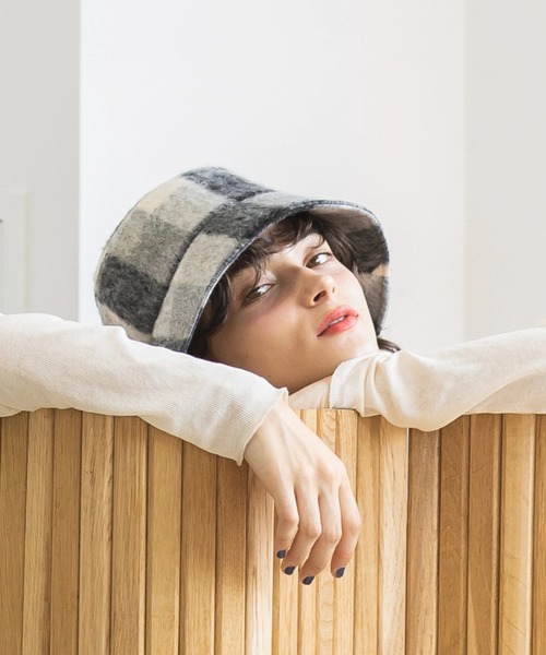 フワフワのシャギーチェックで仕立てたハット。 ほっこりとしたぬくもりを感じさせてくれるデザインで、コーディネートのアクセント使いにも活躍してくれます。 シンプルになりがちなシーズンコーデにもぴったりなアイテムです。 ●製品寸法: F:高さ8.5cm 幅頭周り 57cm 備考: