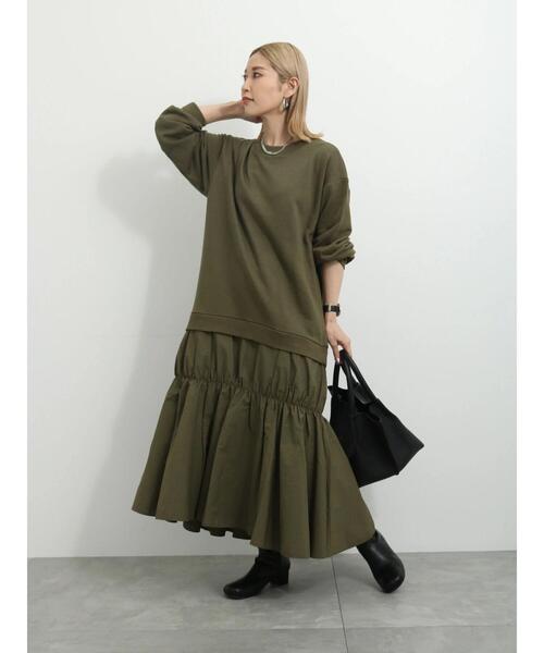 裏毛×ナイロンの異素材ドッキングのワンピース。 トップス部分はシンプルなプルオーバーに。スカート部分はシワ感のあるナイロン素材で切り替えました。ギャザーを施したボリュームのあるティアードデザインが華やかさもプラス。 1枚でもこなれ感たっぷりな着こなしに決まるアイテムです。 ※商品画像は、撮影環境やお客様のご利用のPC・スマートフォンのモニター環境などにより実物と色味に差異がある場合がございます。 【その他採寸】 F 着丈:[前]121cm[後]126cm