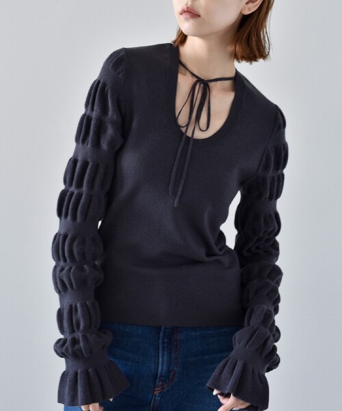 ギャザーを寄せたようなボリュームスリーブがファッショナブルな1枚。 縦長のネックデザインがデコルテをすっきり綺麗に見せてくれます。 首元の華奢な紐はリボン結びでも、クロスさせてバックリボンでも◎ 【CODE A | コードエー】 2023.4.19 debut FAV FASHION.FAV STYLE.をコンセプトに、自分らしく自由にファッションを楽しむ女性にむけたラインナップを提案しています。 ※取り扱いについては、商品についている洗濯表示にてご確認下さい。 ※照明の関係により、実際よりも色味が違って見える場合があります。またパソコン・スマートフォンなどの環境により、若干製品と画像のカラーが異なる場合もございます。 ※製品寸法は平置きのスペックとなっております。こちらの商品は伸縮性があります。 店舗へのお問い合わせ商品番号:R99-17049 ●製品寸法: FREE:着丈56cm B72cm 袖丈70cm 肩幅29cm 備考: