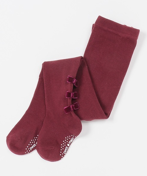 小さなリボン飾りが可愛いアクセントになったタイツです。一枚で着るワンピースに合わせれば防寒にもなる優れもの。足元が寂しくならないデザインは、パンプスなどを選びたい特別な装いにもぴったりです。※90サイズのみ足裏にすべり止めプリントつき。