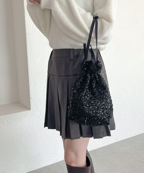 今季トレンドのスパンコールの巾着型バッグです。 ショルダーと手持ちの2WAY仕様。 財布とスマホが入るサイズ感なのでデイリー使いにオススメです。 【スタイリング】 スパンコールバッグをコーデに取り入れるだけで簡単にトレンド感のあるコーデに大変身。 キラキラ感があるもののブラックなので主張しすぎないのが嬉しいポイント。 生産時期により色味が若干異なる場合がございます。ご了承ください。 【ポケット】 なし 【伸縮性】 なし 【透け感】 なし 【クリーニング】 洗濯不可 【裏地】 あり