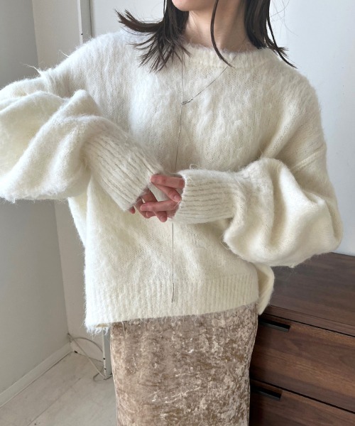 ●Bab●■POINTけがき加工のふわっとしたモヘア感が可愛いニットです。オーバーめのサイジングで今年らしいシルエットながら、重くなりすぎないよう腰回りまでの丈感で綺麗なバランスに仕上げました。アームホールにあえてステッチを掛け、立体感のあるデザインが目を惹くアクセントに。すっきりしたラウンドネックで抜け感のあるスタイルも叶います。ぽわんとしたボリュームスリーブがフェミニンで女性らしく、見た目よりも軽量でストレスのない着心地が好印象の1枚です。■FABRIC軽いタッチのモヘア風けがきニットです。様々な色が入り混じったアクリル繊維の編みが、きらきらして華やかさがあります。■COORDINATEボリューム感のあるニットなので、ボトムスはすっきりしたシンプルなものがオススメです。女性らしいマーメイドスカートやクールな印象のクラッシュデニムに合わせて、今年らしい旬なコーディネートが決まります。…………………透け感:なし裏地:なし…………………※撮影環境により、多少実際のカラーと異なる場合がございます。また、携帯やスマートフォン、パソコンなどの画面上と実物では多少色が異なって見える場合がございます。ご了承下さいませ。※画像の商品はサンプルのため、実際の商品と若干仕様が異なる場合がございます。※濃色品は、過度な摩擦や濡れた状態での摩擦により、色落ち・色移りをする恐れがあります。※この商品は、素材の特性上、洗濯の際に多少の縮みが生じる恐れがあります。洗濯後は形を整えてから干してください。※その他お取り扱いに関しましては、商品に付属のアテンションタグをご覧ください。★商品のお気に入り登録再入荷やラスト1点のお知らせ、セール情報などお知らせを受け取ることができます!★ブランドのお気に入り登録新商品や再入荷などのお得な情報を受け取ることができますので、是非ご登録ください。★Bab公式Instagramアカウント【bab.showroom】で最新情報をチェック!