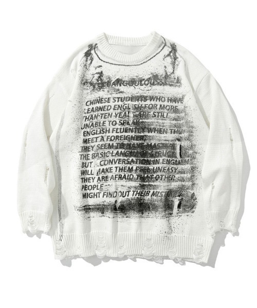 ダメージディテールで漂うユニークなムードがポイント!インパクトのあるデザインで着映え感バッチリな主役級ニット【デザイン】■見どころ満載のデザインでコーデのメインになる1枚フロントのプリントと裾の大胆なダメージ加工で、モードな印象とカジュアルなムードまで同時に演出できる1枚。他にはない個性的なルックスが新鮮で、秋冬のスタイリングを盛り上げてくれること間違いなし。シンプルなアイテムに合わせるだけで雰囲気のあるコーデが仕上がります。■旬のビッグシルエット肩幅、身幅に余裕を持たせたオーバーサイズでヌケ感を楽しめるサイジング。ゆったりとした絶妙なルーズさで、着こなすだけでトレンド感のあるコーデに。着こなしスタイリングに新鮮味をプラスしてくれること必至です!■ ユニセックスアイテムカジュアル、ストリート、きれいめ、韓国系など、スタイルを問わない万能アイテム。メンズ・レディースを問わない男女兼用の対応商品で、プレゼントにもオススメ。ペアやカップルコーデのお揃いにも最適で、家族でシェアしたりと幅広く活躍します。【ファブリック】■ウールのチクチク感が無い肌触りの良い生地程よい膨らみと肌触りの良い素材感。チクチク感が苦手な方でもオススメです。ゆったりめのサイジングを取り入れ、サラッとした程よい生地感で着心地も抜群です。【コーディネート】カーゴパンツやワイドデニムなど太めのボトムスと合わせたスケータースタイルや、トレンドのフレアパンツやスラックスなどと組み合わせた現代風なモードスタイルにも◎ニットキャップやバケットハットを合わせると、更に旬なスタイリングでまとまります。男女共にユニセックスで着用できるので、女性のストリートスタイルにも最適!アイテム次第で様々なコーディネートを楽しめ、韓国ストリート、古着mix、カジュアルと様々なスタイリングと相性◎※画像の商品は光の照射や角度により、実物と色味が異なる場合がございます。生地アップなどの詳細画像が、自然光で見た実物の色味に近くなっております。予めご了承くださいませ。【お買い物をよりお楽しみいただくために】▼商品のお気に入り登録(ハートマークをクリック)完売カラーの再入荷通知や、ラスト1点の通知、セールの通知も受けることができます。▼ブランドのお気に入り登録新商品や再入荷など、いち早くブランドのお得な情報を受け取ることができます。