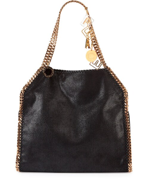 Stella McCartney vegan-friendly, faux leather (polyester) shoulder bag. Signature whipstitching and golden curb-chain trim. Double chain shoulder straps with PEACE charms. Engraved logo disc dangles from strap. Dipped magnetic snap top. Fabric-lined interior. 15"H x 14"W x 3"D. Made in Italy.