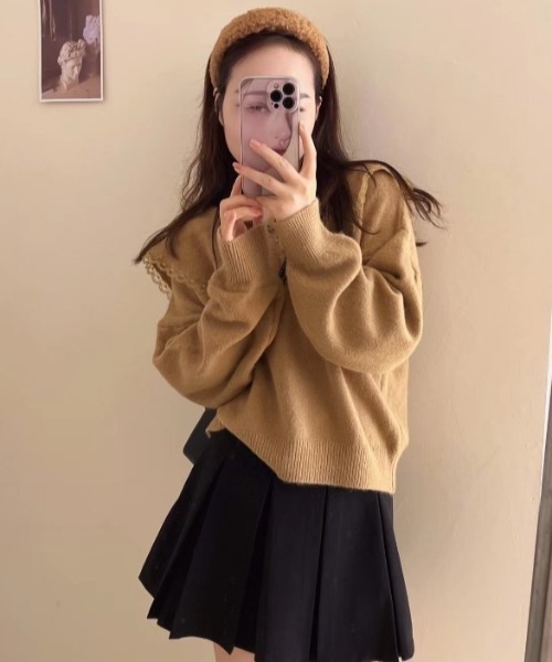 レースの付いたビッグカラーがポイントのニット。もちっとした素材感で肌触りがよく、着心地の良い1枚です。 ゆったりとしたサイズ感でリラックスした着用感です。 使いやすいベーシックカラー展開で春先までお使いいただけます。 ・・・・・・・・・・・・・・・・・・・・ 透け感 : なし 厚さ:普通 伸縮性:あり ・・・・・・・・・・・・・・・・・・・・ ※商品画像は撮影時の光や角度により、実物の色味と異なって見える場合がございます。 ※撮影はサンプル品を使用しており、表示のサイズ感も実物とは若干異なる場合もございますので、予めご了承ください。 ※生産時期により色・素材・サイズ感など多少異なる場合がございます。予めご了承ください。