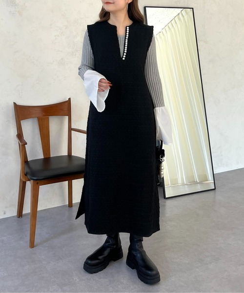 綺麗なIラインに魅せてくれるパールジャンスカ ●パールがアクセントになってくれてアクセいらずでも華やかに! ●ツイード素材ですが柔らかいので着心地◎ ●Iラインで身体のラインを拾わないシルエットに見せてくれます ●キーネックが大人っぽい印象に ●両サイドの裾にスリットが入っているのでぬけ感をプラス ●インナー次第でキレイめにもカジュアルにも着こなせれるアイテム パール / ジャンスカ/き/Vネック/ 大人ワンピ/ロングワンピース / ノースリワンピ / ジャンスカ / -------------------------------------------------------------- 生地の厚さ:普通 伸縮性:あり 透け感:なし 裏地:なし -------------------------------------------------------------- ※商品のお取り扱いに関しましては、商品に付属の アテンションカード、洗濯ネームをご覧ください。 ※撮影場所やお使いのモニター環境により若干お色味が 異なる場合がございます。 特にロケの撮影では明るく見える傾向にございます。 ※サイト上ではフリーサイズの表記ですが、商品タグには Mサイズと表記されている場合がございます。 その場合、ワンサイズでのご用意となりますのでサイズミス などではございません。詳しいサイズはサイズスペックを ご確認いただきますようお願い致します。 ※サイト上でのカラー名とお届けした商品に記載されている カラー名が異なる場合がございますので予めご了承ください。 --------------------《Information》-------------------- 【商品のお気に入り登録】 →カートに入れる右側の【♡マーク】をクリック! 完売カラーの再入荷通知やラスト1点の通知、 セールの通知を受け取ることができます。 【ブランドのお気に入り登録】 →ブランドタグのページから【♡お気に入りショップに追加】 をクリック! 新商品や再入荷など、ブランドのお得な情報を いち早く受け取ることができます。 是非ご登録頂き、お買い物をお楽しみください◎ <返品・キャンセルについて> ・着用・洗濯後の返品は致しかねます。 ・商品到着後、着用前に商品を確認して頂きますようお願い致します。 ※ご注文いただいた予約商品のお届け時期の確認は、注文履歴ページより行えます。