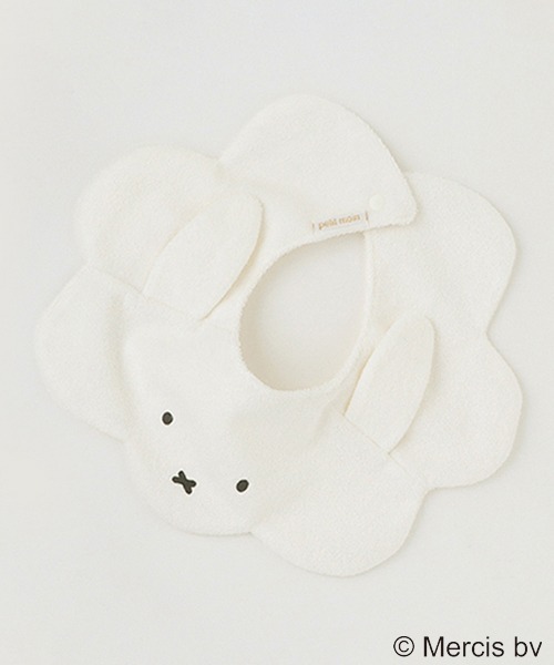 お出かけの装いのアクセントになるスカラップスタイです。 フロントにはアイボリーにミッフィー、モカ茶にボリスをデザインしました。 吸水性に優れたパイル仕様で使い勝手も良好。 スナップボタンで簡単に着脱できるのもうれしいポイントです。
