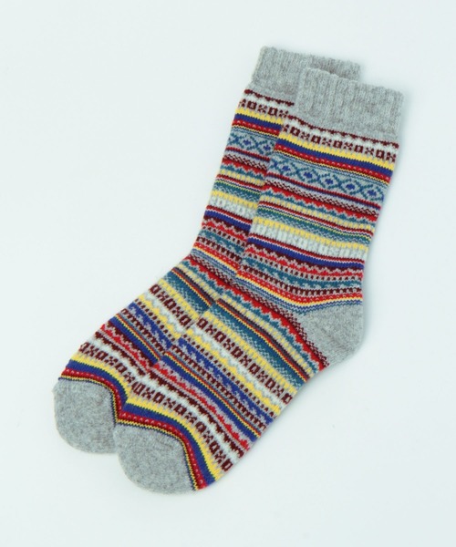 スコットランドのシェットランド諸島にあるフェア島で生まれた、伝統的なパターンの織り方を指すフェアアイル柄のソックス。 カラフルな色の組み合わせによって、何段にも重ねられた美しい幾何学模様が特徴的。 暗くなりがちな秋冬のコーディネートを一気に華やかに見せてくれる一足です。