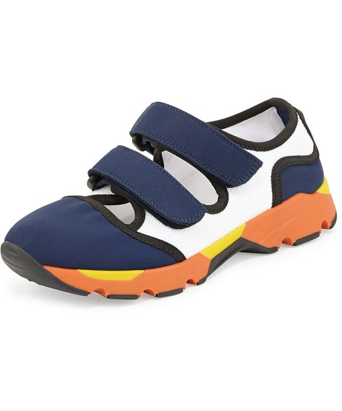 Marni mesh and nylon sneaker. Two grip straps across vamp. Capped round toe. Cushioned insole. Rubber tread sole. Made in Italy.