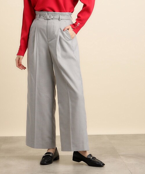 大人クラシカルスタイルが完成するきれいめワイドパンツ 【デザイン】 クラシカルなハウンドトゥースチェックの素材を使用したベルト付きワイドパンツ。 ややハイウエストの設定でトップスをインすれば腰の位置が高く脚長効果も◎ ワイドシルエットですが、センタープレス入りでメンズっぽくなりすぎず女性らしい印象のシルエットに仕上げています。 取り外し可能の共布ベルト付きなのでその日の気分やスタイリングに合わせて着用して頂けます。 ※ポケット数:横×2 【素材】 ウールのような温かみのあるハウンドトゥース柄のツイル素材を使用しています。 裏地付きでストッキングやタイツを履いてもシルエットに影響せずきれいに着用頂けます。 ※裏地あり 【スタイリング】 無地のトップスとのスタイリングでチェックを基調としたコーディネートがオススメ! ダウンやウールのコートとも相性良く着用して頂けます。 コンパクトなリブニットなどをインしてベルトを際立たせたナローシルエットのスタイリングも良いですし、袖にボリュームのあるトップスを合わせてフェミニンなスタイルも◎ その日の気分や予定に合わせて幅広くコーディネートして頂けます。 モデル情報:身長166cm B80 W59 H86 着用サイズ:02(M) 店舗へのお問い合わせ商品番号:768-67047 ●製品寸法: 01(S):W65~89cm H104cm 股下65cm 前股上32cm わたり幅34cm 02(M):W68~92cm H107cm 股下66cm 前股上33cm わたり幅35cm 03(L):W71~95cm H110cm 股下67cm 前股上33cm わたり幅36cm 04(LL):W74~98cm H113cm 股下68cm 前股上33cm わたり幅37cm 05(3L):W77~101cm H116cm 股下68cm 前股上33cm わたり幅39cm 備考: