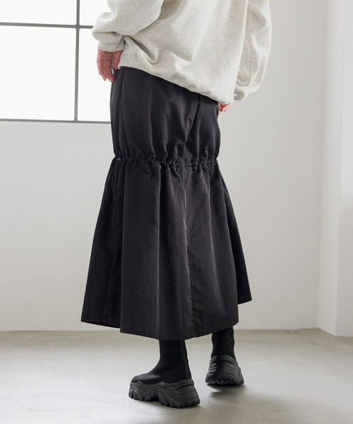 シルエットを変化することができるドロスト紐がデザインされたスカート。そのままで穿けば広がりのあるフレアシルエット、紐を絞ってもも回りが細身のシャーリングシルエットが楽しめる1枚です。着丈が長いのでブーツアイテムとの相性も〇ウエストはゴム仕様なのでラフな着心地もポイントです。【素材】上品な微光沢感と滑らかで表情のあるナイロン素材を使用。適度な張り感と安心感のある厚さもポイントです。【スタイリング】適度にボリューム感のあるシルエットなので、コンパクトな丈感のトップスを合わせたスタイリングがおすすめ。シルエットをスッキリめに調節すればルーズなトップスもバランス良く好相性〇