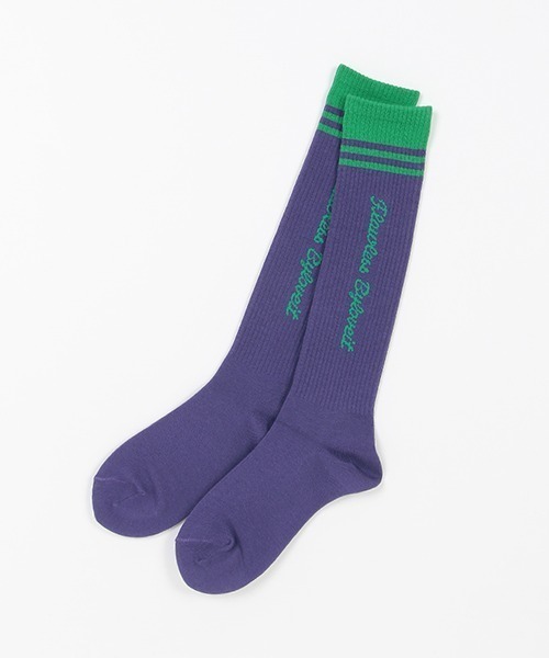 縦ロゴ×ラインのキャッチーなデザインが可愛いハイソックスです。シンプルながらもバイカラーの色合いでおしゃれ度をアップしました。お洋服に合わせやすいので、ワンピースやショート丈のボトムス、ブーツなどのいろいろなアイテムとコーディネートできる一足です。