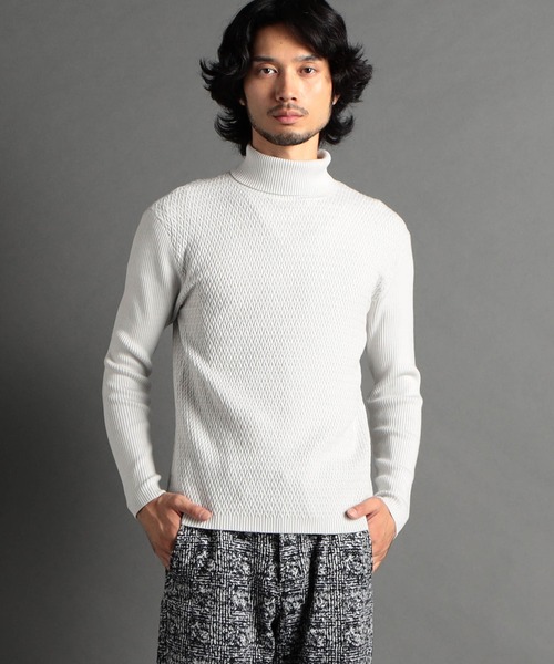 ■デザイン12ゲージのハイゲージタートルネックニットになります。落ち着きのある柄感が上品な印象。衿と袖はリブ編み仕様で、ジャケットのインナ-にも使いやすいサラッとした質感です。マシンウオッシャブル対応のイ-ジ-ケアも魅力的なポイント。嫌味の無いシンプルなデザインが使い勝手の良いアイテムとなっています。■サイズ普通■素材ナイロン、ポリエステル、アクリル、ウールの混紡糸。山が連なっている様なジグザグ模様が特徴的なシェブロン柄をプレ-ティング編みで表現しました。伸縮性:あり生地の厚さ:やや薄手裏地:なし■注意点染色の性質上、色落ちがありますので他の物と分けて洗って下さい。なお縮むこともありますので、形を整えてから干して下さい。生地の性質上、摩擦によりピリングが起こることがあります。着用時及びクリーニング等の取り扱いに御注意ください。