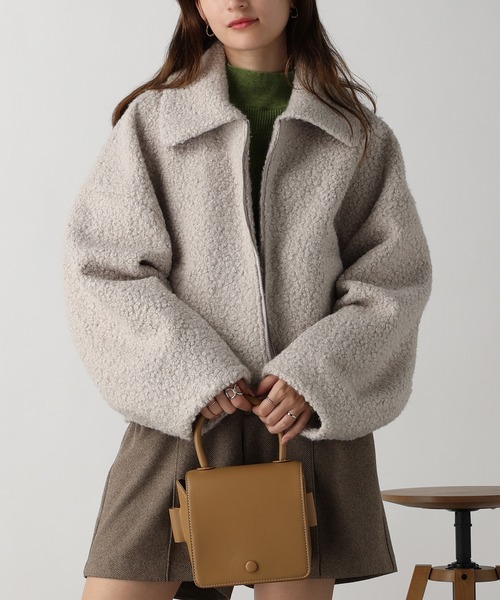 圧縮ブークレ素材がやわらかくて暖かい、ジップアップブルゾン♪やわらかくふっくらとした質感に、ウール調のカールした毛足が印象的な表面にニュアンスのあるアウターです。圧縮ブークレ素材でふっくらとした質感に特有の表面のポコポコとした凹凸感も特徴。 目が詰まっていて軽さがあるのに保温性は抜群◎ どんな身長、どんなスタイリングにもマッチする着回しやすい着丈感もポイントです。 便利なサイドポケット付き。襟付きのシンプルなデザインながらも、立体アームシルエットがこなれ感を演出。 全体的なシルエットにメリハリをつけてくれます。 ★《お気に入り登録》でお得な情報をGET★ ・「商品のお気に入り登録」で再入荷通知やラスト1の通知、セールやクーポンの通知も受け取ることができます!→ハートマークをクリック ・「ブランドのお気に入り登録」で新商品や再入荷など、お得な情報を受け取ることができます!