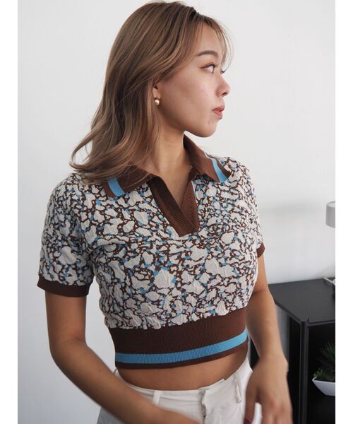 抽象的な柄のジャガードニットです。異なる素材の糸を使用し表面に立体感のある編地に仕上げています。ショート丈でコンパクトなデザインとなっており、また襟と裾に入ったラインでスポーティーな印象で着こなしていただけるデザインとなっています。