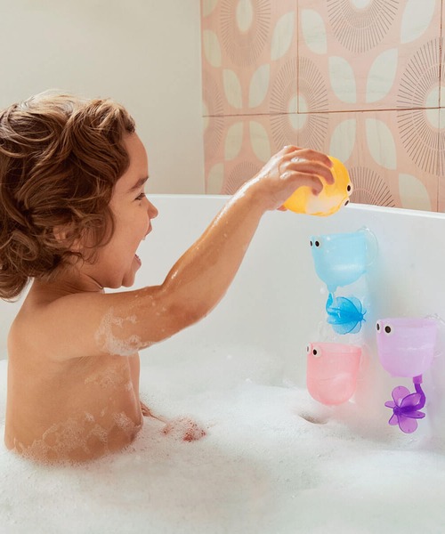 バスタイムが楽しくなるカラフルなバストイ♪すくったり、壁にくっつけたりと遊び方が自由自在! 水をながすと穴からちょろちょろでてきたり、プロペラがクルクルまわるよ! かたちの違う4つのカップで水の流れの違いを楽しもう! カップで水をすくったり吸盤で壁にくっつけたり 組み合わせて楽しく遊べる♪子どもの自由な発想を引き出します 【お手入れ方法】 ●水洗い後、よく乾燥させてから風通しの良い場所で保管してください。 【サイズ】 パッケージ W21.5×D8.2×H25.3 プロペラなし・吸盤なし W6.5×D6.5×H8.0cm(19g) プロペラなし・吸盤あり W6.5×D7.3×H8.0cm(26g) 横回転プロペラ・吸盤あり W6.5×D7.3×H13.0cm(31g) 縦回転プロペラ・吸盤あり W6.5×D7.3×H13.0cm(35g) 【対象年齢】 12カ月から 【注意事項】 ●保護者の目の届く場所でご使用ください。 ●破損、変形した製品は使用しないでください。 ●本来の用途以外には使用しないでください。 ●火気や暖房器具に近づけないでください。 ●高温多湿、乾燥、温度変化の激しい場所を避けて保管してください。 ●ぶつけたり、こすったり、濡れたままで放置した場合、他のものに色が付着するおそれがありますのでご注意ください。 ●石鹸等が付着したまま放置すると、塗装がはがれたり、溶け出す場合があります。 ●表面に凸凹のある面や材質により、吸盤が付かない場合があります。 ●吸盤が付きにくい場合は、吸盤部分をお湯に浸してから取り付けてください。 ※商品仕様は予告なく変更される場合があります。 ※本取扱説明はお子さまの手の届かない場所に保管し、必要に応じてご参照ください。 株式会社ダッドウェイ お客さま相談室 0120-880-188