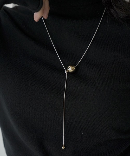 ボールがポイントのデザインネックレスアイテム!【デザイン】長さ調整可能なスライドデザインでスタイリングに合わせてお好みの長さで付けていただけます。印象がかわるシルバーとゴールドの2カラー展開*シンプルだけど、こなれ感のあるデザインの高見えアイテムです!【素材】真鍮【スタイリング】シンプルなトップスに合わせても、ワンピーススタイルに合わせてもおすすめのアイテム!服にあわせてネックレスの長さや形を変えることができるのでいろんなスタイリングが楽しめます*付けるだけで上品なムードを作ってくれる1つは持っていたいネックレスアイテムです。※お使いのモニター設定、お部屋の照明等により実際の商品と色味が異なる場合がございます。物撮り写真はできる限り実物の色に近づけるようにしておりますので、色に関しては商品の物撮り写真をご参考ください。▼もっとお買い物を楽しんで頂く為に▼〈商品のお気に入り登録〉お気に入りの登録をして頂きますとセールの通知・ラスト1点になった時の通知や、再入荷通知を受けることができます。〈ブランドのお気に入り登録〉新商品の発売や再入荷、タイムセールやクーポン発行のお知らせなどhellamがお届けするお得な情報を受け取ることができます。