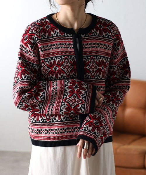 ♦ヴィンテージライクな柄が可愛いニットカーディガン♦ 古着から着想を得て、オリジナル柄のニットカーディガンを作りました。 柄が印象的な分、身頃は少しコンパクトなサイズ感と袖は太めでストンとした形で、 すっきりと着られるようにしています。 ■MATERIAL 程よい肉感がございます。 ■手洗い可 ---------------------- 透け感:なし 伸縮性:なし 光沢感:なし ---------------------- 【注意事項】 ※サンプルで撮影しているため、実際の商品と仕様が異なる場合がございます。 ※商品画像は、撮影時の光の当たり具合やパソコンなどの閲覧環境により、実際の色味と異なって見える場合がございます。予めご了承ください。