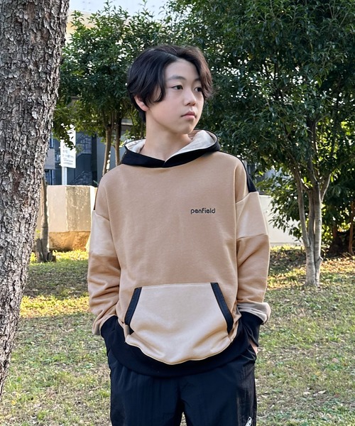米国のアウトドアブランドPenfieldとのコラボアイテム。 同系色の切り替えが、レトロでスポーティーな印象の商品。 シンプルなボトムと合うデザイン性の高いパーカーです。 ポリエステル混なので、お洗濯しても乾きやすく、冬のアウトドアや汗をかきやすいアクティブな男の子には最適☆ 襟元や、袖口は汚れが気にならない濃色のリブで仕上げました。 【Penfield(ペンフィールド)】とは Penfieldは1975年アメリカ・マサチューセッツにて設立されました。 ブランド設立当初よりモンデンミルズ社が開発したポーラフリースを使用するなど、先進性のある製品を開発し続けてきました。 その精神は今も変わらずにレガシーを継承しつつ、時代とともに最適にアップデイトされた機能性・実用性に優れた製品を提供し続けます。 【モデル】 身長155cm、体重41kg 着用サイズ:160cm ※モデル着用の商品は、こちらのページの商品以外は参考イメージとなっております。 【透け感】なし【伸縮性】あり【裏地】なし【ポケット】あり※フロントポケット×1
