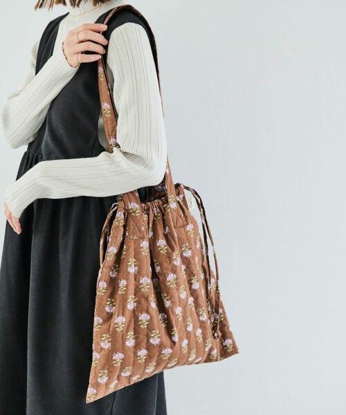 レトロな雰囲気漂う花柄のキルティングバッグ。 縦ラインのステッチでシンプルめなキルティングデザインに仕上げました。 A4も収まるサイズ感でデイリー使いにも◎ 開口部は絞れる巾着デザインなので、中身が見えないのも嬉しいポイント。 薄手の中綿を使用しボリュームが出過ぎないようにました。 サイドのタグにはブランドロゴ入りでさり気ないポイントに。 小物の収納に便利な内ポケット付きです。