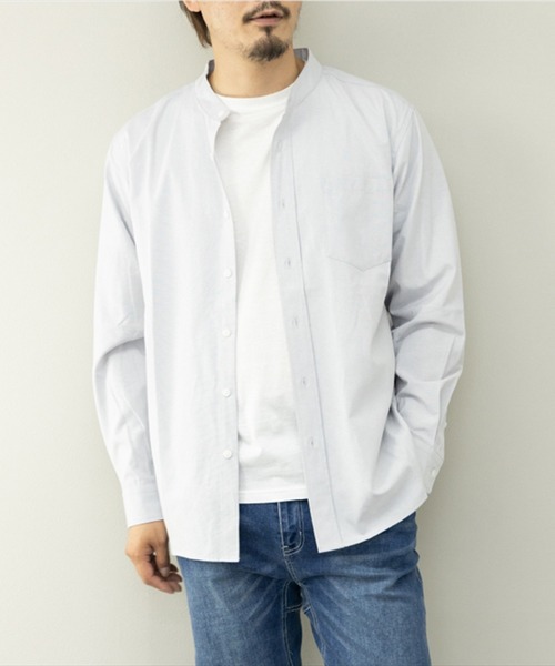 ベーシックデザインの長袖バンドカラーオックスフォードシャツ。 シンプルで使い勝手のいいアイテム。 一つ持っておくと便利な一着です。 プチプライスなのも嬉しいポイントです。 ●品のあるバンドカラーのカジュアルシャツ ●生地は綿100%に比べ洗濯後の乾きも早く取り扱いのしやすい、TCオックス生地 ●胸には実用性の高いポケットを配置 ●バックにはセンタータックを入れ、身体に沿って適度にゆとりのある綺麗なシルエットに ●レディースでも着られるジェンダーレスなデザイ