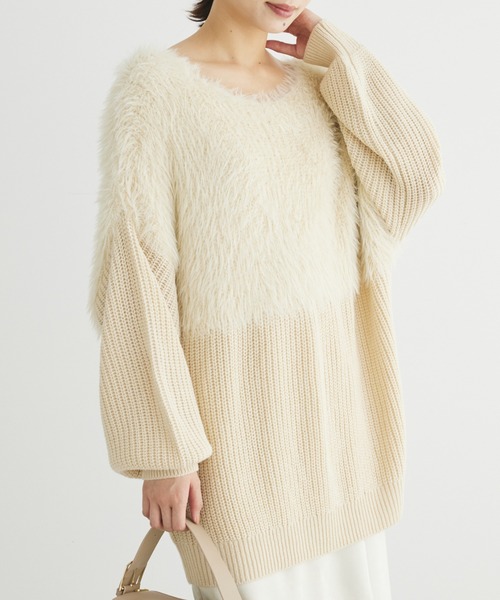 ふんわりとしたシャギー切り替えが可愛らしい印象を与えるニット。 凹凸感のある畦編みを施し、落ち着いた雰囲気を演出します。 ゆったりとしたシルエットで程よくこなれた着こなしを楽しめるのもポイント◎ スタイリングに取り入れればシーズンムードを高めてくれるアイテムです。 透け感[無し] 裏地[無し] 伸縮性[有り] 光沢感[無し] 生地の厚さ[普通] 付属品[無し] ポケット[無し] ●製品寸法: F:バスト60cm 着丈60cm 袖丈43cm 肩幅62cm 裾幅50cm 備考: