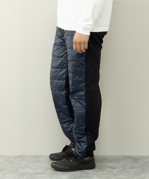 タウンユースにオススメの切り替えダウンパンツ。軽くて暖かい着心地。一着持ってて損なしのアイテムです。●防寒対策抜群のダウン入りイージーパンツ●ダウンを18%使用し、軽やかで暖かな穿き心地を実現●フロントはナチュラルな防風性、撥水性に優れたポリエステル生地●バックはストレッチ性のあるジャージー素材で切り替え●ジャージ素材の裏は起毛感のあるトリコット素材で、暖か●ウエストはリブとドローコードのイージーパンツ仕様●裾はジョガーパンツ仕様ですっきりと●シルエットは程よくゆとりのあるテーパードシルエット