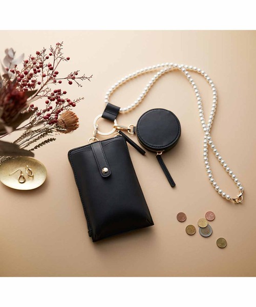 コーデに華やぎを差すジュエリー感覚の新ツール スマホショルダーをフェミニンな装いに似合う上品なデザインで作りました。 アクセサリー感覚のパール風チェーンが華やかで、ゴールドカラーの金具がリュクスな表情。 カードホルダーを内蔵した四角いポーチとイヤホンなどが入る丸いポーチは取り外し自在です。 セット内容 / スマホポーチ1個、サークルポーチ1個、リング付きショルダーストラップ1本 ●サイズ スマホポーチ :縦約19cm 横約12cm(本体下部) まち幅約2.5cm サークルポーチ:直径約9cm まち幅約2.5cm ショルダーストラップの長さ約107cm(金具部分含まず) 重さの目安 :350g