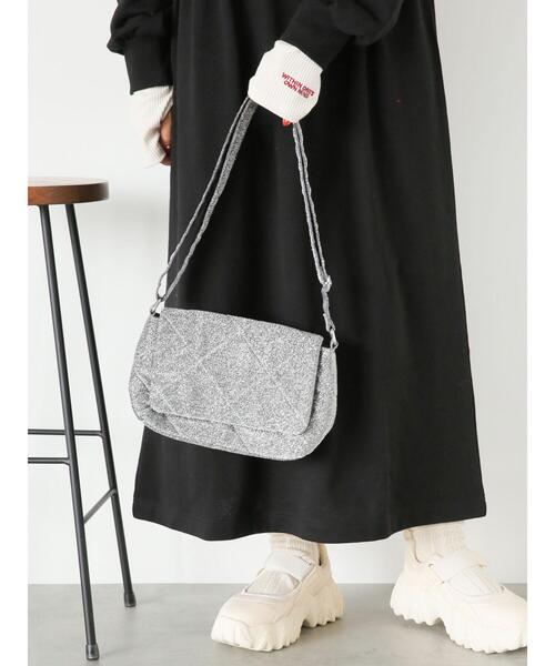 きらきらとしたラメがたっぷりとあしらわれたバッグ。 キルティングのようなデザインで、可愛らしさを演出します。 小物類を整理できる内ポケット付きもポイント◎ スタイリングのアクセント使いにぴったりなアイテムです。 ※商品画像は、撮影環境やお客様のご利用のPC・スマートフォンのモニター環境などにより実物と色味に差異がある場合がございます。 【その他採寸】 F 全長:[ショルダー]126cm