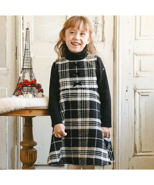 あたたかみのあるラメツイードを使用したチェック柄のジャンパースカート。 大き目の柄とキラキラ光るラメ糸が、パーティーシーズンにぴったりの華やかな1着です。 胸元にはベロアリボンを並べてかわいらしさをプラス。 きれいなフレアのシルエットもおすすめポイントです 同じ素材を使用したスカートやベビーサイズのジャンパースカートもあるので、姉妹でおそろいのコーデも楽しんでいただけます。