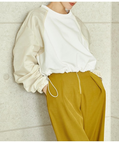 袖部分を異素材で切り替えたデザインのラグラン裏起毛トップス。 ●袖はシャカシャカとしたポリエステル素材で、肩に入ったダブルラインと相まってトレンドのスポーツMIXコーデにピッタリ! ●裾のドローコードで絞ることでシルエットを調節でき、動きのあるスタイルが完成します。 ●短めの着丈がボトムとのバランスも取りやすく、すっきりした形のボトムやショートパンツ+ロングブーツなどと合わせるとよりスタイルアップして見える着こなしに◎ ●シンプルな無地なので柄物との相性も抜群です。 ※袖部分ストレッチなし※裏地なし ※裾ドローコードで調節可 ※商品のお取扱いに関しましては、商品に付属のアテンションカード、洗濯ネームをご覧ください。 ※モデル着用画像は光の当たり具合で色味が違って見える場合がございます。 ※商品の色味の目安は、色見本画像をご参照ください。 【お買いものをお楽しみいただく為に!】 ▼商品のお気に入り登録 完売カラーの再入荷通知や、ラスト1点の通知、セールの通知も受け取ることができます。 ▼ブランドのお気に入り登録 新商品や再入荷など、いち早くブランドのお得な情報を受け取ることができます。