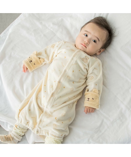 触り心地のいいスムース生地を使用した2WAYオール。 身生地はいろんなアニマルがくつろいでいるプリント柄。 お気に入りの動物さんは見つかったかな?? 胸元のモチーフパッチ刺しゅうや袖口でスヤスヤ眠るアニマルフェイスは「オフホワイト:クマ」、「ピンク:ウサギ」でカラーごとに異なるのがポイント! お子様の成長に合わせてスナップボタンでドレス型、パンツ型の2通りで着用可能◎ ワンサイズ展開で生まれたてから6か月ころまで長くご着用いただけるので、サイズ選びが難しいベビーギフトにもおすすめです。 赤ちゃんの快適な睡眠をサポートしてくれる優秀アイテムです。 同じ柄を使用したスタイ(1834-57031)やスリーパー(1834-57020)と合わせたベビーが大好きアニマルいっぱいギフトがオススメ。 コーディネートになじむオフホワイト、女の子らしいピンクの2色展開です。 ※柄の出方は生地の裁断により一点一点異なります。 2023年秋冬男の子・女の子アイテム。 【SLAP SLIP(スラップ スリップ)】 ~子どもの欲しいをカタチに~ ヨーロッパのこどものように 子どもらしい今しか着れないナチュラルなかわいさを提案 どこか上品で清楚感漂うフレンチカジュアルは いつものコーディネートをさりげなく格上げ