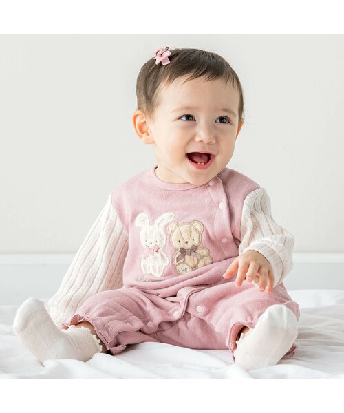クマさんとウサギさんのパッチが印象的な長袖ロンパース。 もこもこなボアを使用したクマさんと、フワフワなファーを使用したウサギさんは、まるでぬいぐるみのような触り心地。 サイドホックですべて開くので、首の座っていない赤ちゃんでも楽に着脱できます。 おなかにスナップボタンがあたらないのでうつぶせ・ずりばいの時期のベビーにぴったり◎ 股下にはスナップが付いていて、足をバタバタしてもはだけにくく、オムツ替えもラクラクな設計です。 秋冬のお出かけやデイリー使いにピッタリ。 クマさんとウサギさんのパッチを使用した、おねえちゃんサイズのワンピース(1807-57008)も展開しているので、姉妹やお友達とのお揃いコーデが◎ お揃いコーデを着て、おでかけを楽しんじゃお! 女の子らしいピンクと落ち着いたブルーの2色展開です。 2023年秋冬女の子アイテム。 【SLAP SLIP(スラップ スリップ)】 ~子どもの欲しいをカタチに~ ヨーロッパのこどものように 子どもらしい今しか着れないナチュラルなかわいさを提案 どこか上品で清楚感漂うフレンチカジュアルは いつものコーディネートをさりげなく格上げ