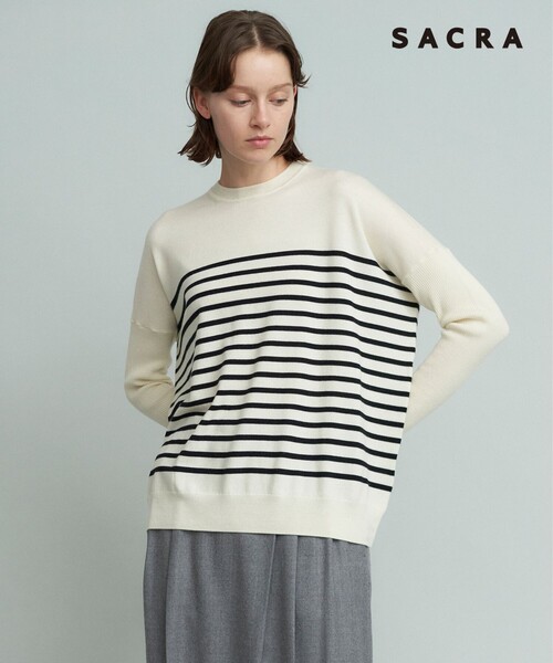23区 meets SACRA 2023 FALL/WINTER 23区30周年を記念したカプセルコレクション「23区 meets SACRA」。しなやかで自由な女性像を表現するブランド「SACRA」、23区限定カラーを加えた特別な秋冬コレクションです。 EX.FINE MERINO BORDER TOP / エクストラファインメリノ ボーダートップ 柔らかく滑らかな風合いが特徴の上質なエクストラファインメリノウールを使用したボーダーニットプルオーバー。 ハイゲージのパネルボーダーでカジュアル見えにならず大人な印象に。ワイドなボディフォルムに対して程よくフィット感のあるリブスリーブのコントラストがデザインポイント。袖口でたるませる長めの袖丈です。ベーシックなホワイト系(#101)、シックなカーキ系(#154)に加えて、23区別注ネイビー系(#175)の3色展開です。 SACRA / サクラ 2008 年 SPRING COLLECTION からブランドスタート。ブランド名の由来は、ディレクターの娘の名前から。また日本の気分や情緒を発信していきたいという思いをこめて。様々な洋服やカルチャーを楽しんできた女性の遊び心やナチュラルな美しさを表現したい。軽やかに自然体で、今を大切にする人のために。未来は今の積み重ね。独自の視点から時代の空気をとらえ、ON/OFF、TENSION/RELAX、WOMEN/MEN など、反する要素のミックス感をマテリアルや独特のカッティング、ドレープでつくりあげ、しなやかで自由な女性像を表現します。