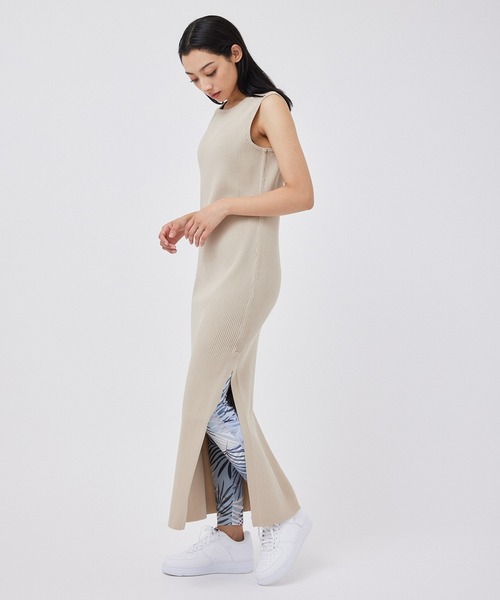 【デザイン・シルエット】スポーティな艶感のある素材を使用したニット素材のワンピース。マキシ丈のシルエットとサイドにスリットの入った裾で、アクティビティなシーンにも最適な風通しの良い着心地を実現しました。ゆったりとしたフィット感でシーズンレスにスタイリングを組めます。ヨガの行き帰りなど、ブラタイツとのスタイリングもおすすめ。【素材】-----透け感:なし裏地:なし伸縮性:あり光沢感:微光沢生地の厚さ:普通-----【着用サイズ】H165 B85 W61 H88着用サイズFREE※実際の商品はお客様のお使いの端末や閲覧環境により、写真と実物の色味や質感が多少異なって見える場合がございます。予めご了承ください。