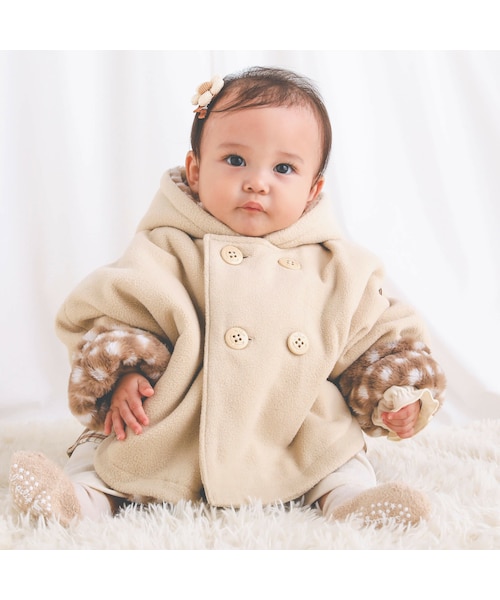 フード付きのPコート風のデザインがキュートなベビー用マント。 袖部分にほどこしたエンブレム風の刺しゅうがオシャレなポイント◎ フロント部分に4つならんだボタンがアクセントになっています。 裏地に使用したボアのチェック柄がチラッと見えるキュートなアイテム。 表地にフリース生地、裏にはボア素材を使用して体温調節の苦手なベビーのお出かけをサポート。 熱を逃がしにくく、温かさを保ってくれるので寒くなってくる秋冬に大活躍すること間違いなし。 通園や公園遊び、お散歩などのデイリー使いにはもちろん、ちょっとしたお出かけにもオススメです。 落ち着いたネイビーと合わせやすいベージュの2色展開です。 ※柄の出方は生地の裁断により一点一点異なります。 2023年秋冬男の子・女の子アイテム。 【SLAP SLIP(スラップ スリップ)】 ~子どもの欲しいをカタチに~ ヨーロッパのこどものように 子どもらしい今しか着れないナチュラルなかわいさを提案 どこか上品で清楚感漂うフレンチカジュアルは いつものコーディネートをさりげなく格上げ