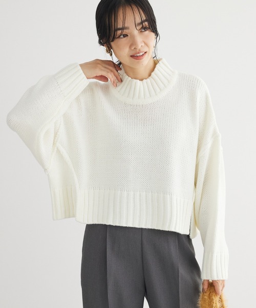 太リブがアクセントになったハイネックデザインのニット。 ショート丈でバランスよくスタイリングでき、スタイルアップ効果も期待できます。 裾のサイドスリットもさりげないヌケ感をプラス。 カジュアルからキレイめコーデにと、幅広く活躍してくれるアイテムです。 透け感[無し] 裏地[無し] 伸縮性[有り] 光沢感[無し] 生地の厚さ[普通] 付属品[無し] ポケット[無し] ●製品寸法: F:バスト70cm 着丈46cm 袖丈43cm 肩幅67cm 裾幅67cm 備考: