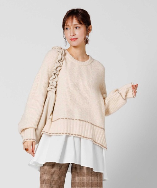 温かみのあるニット素材を利用した布帛レイヤードプルオーバーです。編み地にもこだわり、トレンドの配色ステッチでサマになる1枚着アイテムです。■着用コメント(女性) 155㎝身幅がワイドでゆったりとしたシルエット。長めにドッキングされたお裾のシャツ部分はフワッと広がって、気になるヒップから太ももにかけてをカバーしてくれます🫶🏼ステッチデザインが旬のガーリーニットで冬モテしちゃいましょ🪄アウターの裾からチラッと出すリブがさりげないキュンpoint■着用コメント(女性) 156㎝丈が長くチュニックの様に着られるニット✨肩落ちのデザインで肩幅広い私でも華奢見えできました...笑フェイクレイヤードのシャツ部分はたっぷりとしているのでふんわり広がるシルエットが可愛いですよ✨アウターを着てもチラッと見えるほどの丈感✨裾と袖に白のラインが入っているところも可愛いポイント🤍■着用コメント(女性) 169㎝シャツを重ね着しているようなデザインで1枚でサマになるニット。丈が長めで腰まわりまでカバーできるのもポイントです。温かみのあるニット素材で配色ステッチも可愛い◎《 HONEYSUCKLE ROSE 》クラシックでベーシックテイストを根底に、いつもおしゃれでかわいく、そんな女の子が今着たいガーリー・テイストを提案していくブランド。ーーーーーーーーーーーーーーーーーーーーーーーーーーーーお得に&便利にお買い物を楽しむポイント♪▶商品のお気に入り登録( ♥ハートマーク をクリック)お気に入りアイテムの完売カラーの再入荷通知や、ラスト1点の通知、セールなどの情報をいち早くお届け。▶ショップ・ブランドのお気に入り登録新商品や再入荷、クーポン配布などお得な情報を随時お届け。ーーーーーーーーーーーーーーーーーーーーーーーーーーーー