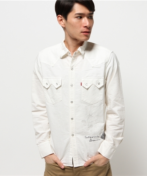 メイドインジャパンの長袖ソウトゥースウエスタンシャツ、オフホワイト。きれいめナチュラルなオフホワイトにパールのスナップドットが上品に映える。左前身頃の下側には、手描き風カリフォルニアプリントと刺繍のコンビネーションをさり気なく配した。定番のデニムスタイルも、ハットで味つけしてこなれた雰囲気に。 ※トップスのサイズ感は、S=M(Japan size) M=L (Japan size)となります。